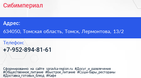 Сибимпериал по адресу 634050, Томская область, Томск, Лермонтова, 13/2 в дальнейшем Организация, размещена в следующих категориях: