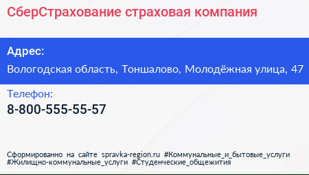 СберСтрахование, страховая компания по адресу Вологодская область, Тоншалово, Молодёжная улица, 47 в дальнейшем Организация, размещена в следующих категориях: