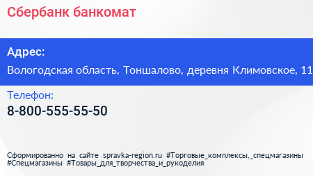 Сбербанк, банкомат по адресу Вологодская область, Тоншалово, деревня Климовское, 11 в дальнейшем Организация, размещена в следующих категориях: