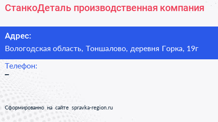 СтанкоДеталь, производственная компания по адресу Вологодская область, Тоншалово, деревня Горка, 19г в дальнейшем Организация, размещена в следующих категориях: