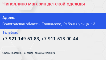 Чиполлино, магазин детской одежды по адресу Вологодская область, Тоншалово, Рабочая улица, 13 в дальнейшем Организация, размещена в следующих категориях: