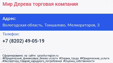 Мир Дерева, торговая компания по адресу Вологодская область, Тоншалово, Мелиораторов, 3 в дальнейшем Организация, размещена в следующих категориях: