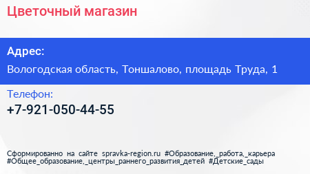 Цветочный магазин по адресу Вологодская область, Тоншалово, площадь Труда, 1 в дальнейшем Организация, размещена в следующих категориях: