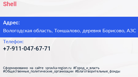 Shell по адресу Вологодская область, Тоншалово, деревня Борисово, АЗС в дальнейшем Организация, размещена в следующих категориях: