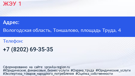 ЖЭУ №1 по адресу Вологодская область, Тоншалово, площадь Труда, 4 в дальнейшем Организация, размещена в следующих категориях: