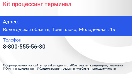 Kit процессинг, терминал по адресу Вологодская область, Тоншалово, Молодёжная, 1в в дальнейшем Организация, размещена в следующих категориях: