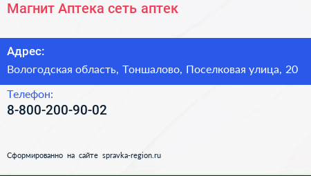 Магнит Аптека, сеть аптек по адресу Вологодская область, Тоншалово, Поселковая улица, 20 в дальнейшем Организация, размещена в следующих категориях: