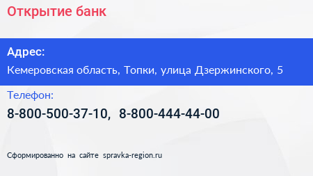 Открытие, банк по адресу Кемеровская область, Топки, улица Дзержинского, 5 в дальнейшем Организация, размещена в следующих категориях: