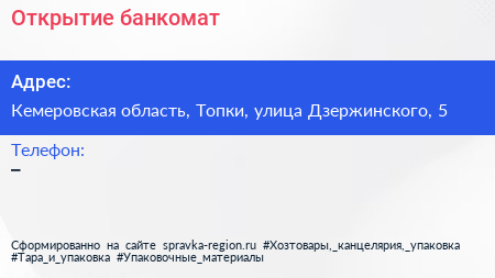 Открытие, банкомат по адресу Кемеровская область, Топки, улица Дзержинского, 5 в дальнейшем Организация, размещена в следующих категориях: