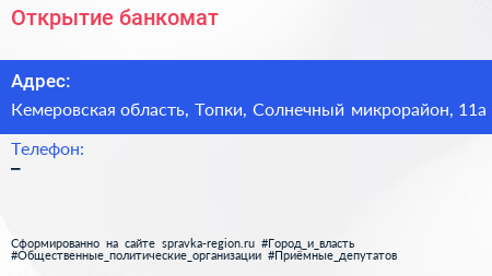 Открытие, банкомат по адресу Кемеровская область, Топки, Солнечный микрорайон, 11а в дальнейшем Организация, размещена в следующих категориях: