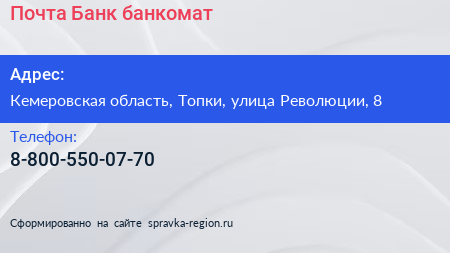 Почта Банк, банкомат по адресу Кемеровская область, Топки, улица Революции, 8 в дальнейшем Организация, размещена в следующих категориях: