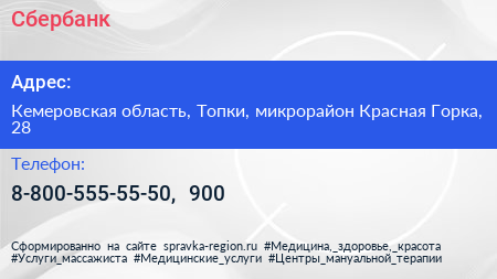 Сбербанк по адресу Кемеровская область, Топки, микрорайон Красная Горка, 28 в дальнейшем Организация, размещена в следующих категориях: