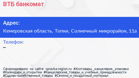 ВТБ, банкомат по адресу Кемеровская область, Топки, Солнечный микрорайон, 11а в дальнейшем Организация, размещена в следующих категориях: