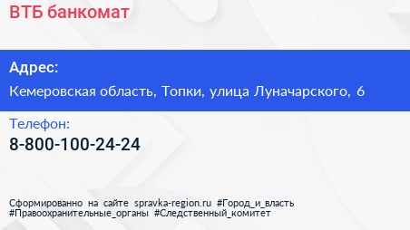 ВТБ, банкомат по адресу Кемеровская область, Топки, улица Луначарского, 6 в дальнейшем Организация, размещена в следующих категориях: