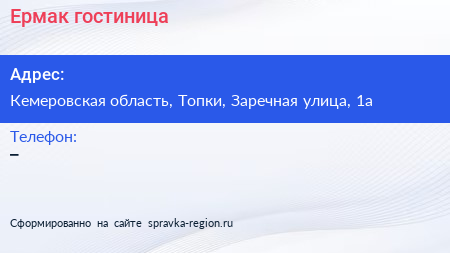 Ермак, гостиница по адресу Кемеровская область, Топки, Заречная улица, 1а в дальнейшем Организация, размещена в следующих категориях: