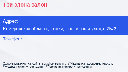 Три слона, салон по адресу Кемеровская область, Топки, Топкинская улица, 2Б/2 в дальнейшем Организация, размещена в следующих категориях: