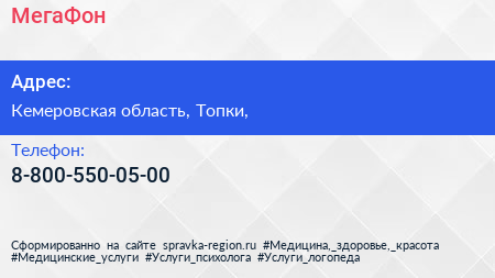 МегаФон по адресу Кемеровская область, Топки, в дальнейшем Организация, размещена в следующих категориях: