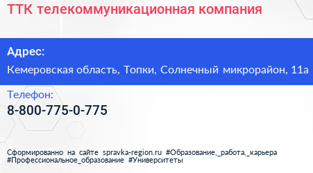 ТТК, телекоммуникационная компания по адресу Кемеровская область, Топки, Солнечный микрорайон, 11а в дальнейшем Организация, размещена в следующих категориях: