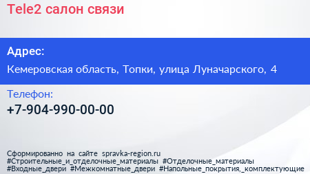 Tele2, салон связи по адресу Кемеровская область, Топки, улица Луначарского, 4 в дальнейшем Организация, размещена в следующих категориях: