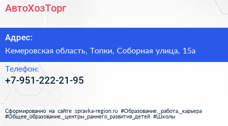 АвтоХозТорг по адресу Кемеровская область, Топки, Соборная улица, 15а в дальнейшем Организация, размещена в следующих категориях: