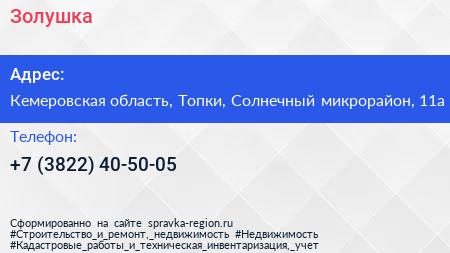 Золушка по адресу Кемеровская область, Топки, Солнечный микрорайон, 11а в дальнейшем Организация, размещена в следующих категориях: