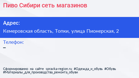Пиво Сибири, сеть магазинов по адресу Кемеровская область, Топки, улица Пионерская, 2 в дальнейшем Организация, размещена в следующих категориях: