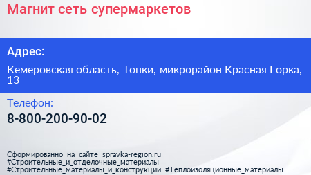 Магнит, сеть супермаркетов по адресу Кемеровская область, Топки, микрорайон Красная Горка, 13 в дальнейшем Организация, размещена в следующих категориях: