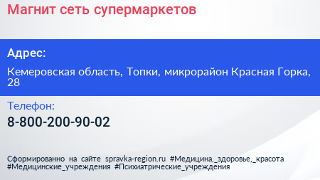 Магнит, сеть супермаркетов по адресу Кемеровская область, Топки, микрорайон Красная Горка, 28 в дальнейшем Организация, размещена в следующих категориях: