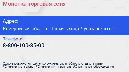 Монетка, торговая сеть по адресу Кемеровская область, Топки, улица Луначарского, 1 в дальнейшем Организация, размещена в следующих категориях:
