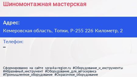 Шиномонтажная мастерская по адресу Кемеровская область, Топки, Р-255 226 Километр, 2 в дальнейшем Организация, размещена в следующих категориях:
