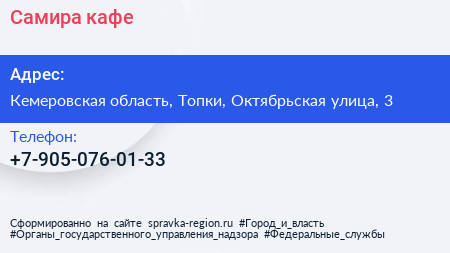 Самира, кафе по адресу Кемеровская область, Топки, Октябрьская улица, 3 в дальнейшем Организация, размещена в следующих категориях: