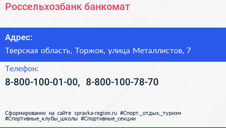 Россельхозбанк, банкомат по адресу Тверская область, Торжок, улица Металлистов, 7 в дальнейшем Организация, размещена в следующих категориях: