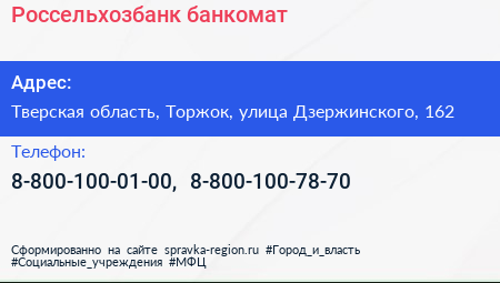 Россельхозбанк, банкомат по адресу Тверская область, Торжок, улица Дзержинского, 162 в дальнейшем Организация, размещена в следующих категориях: