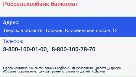 Россельхозбанк, банкомат по адресу Тверская область, Торжок, Калининское шоссе, 12 в дальнейшем Организация, размещена в следующих категориях: