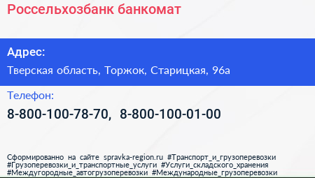 Россельхозбанк, банкомат по адресу Тверская область, Торжок, Старицкая, 96а в дальнейшем Организация, размещена в следующих категориях: