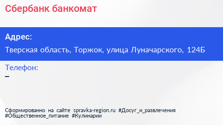 Сбербанк, банкомат по адресу Тверская область, Торжок, улица Луначарского, 124Б в дальнейшем Организация, размещена в следующих категориях: