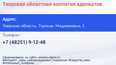 Тверская областная коллегия адвокатов по адресу Тверская область, Торжок, Медниковых, 1 в дальнейшем Организация, размещена в следующих категориях: