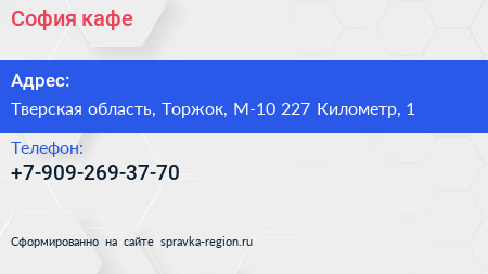 София, кафе по адресу Тверская область, Торжок, М-10 227 Километр, 1 в дальнейшем Организация, размещена в следующих категориях:
