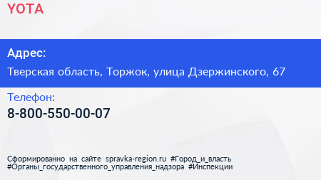 YOTA по адресу Тверская область, Торжок, улица Дзержинского, 67 в дальнейшем Организация, размещена в следующих категориях: