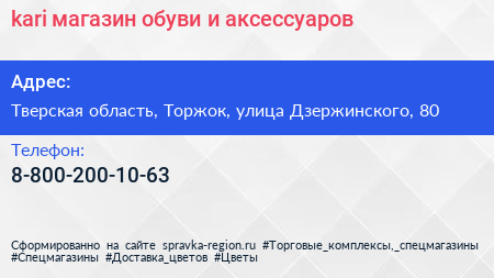 kari, магазин обуви и аксессуаров по адресу Тверская область, Торжок, улица Дзержинского, 80 в дальнейшем Организация, размещена в следующих категориях: