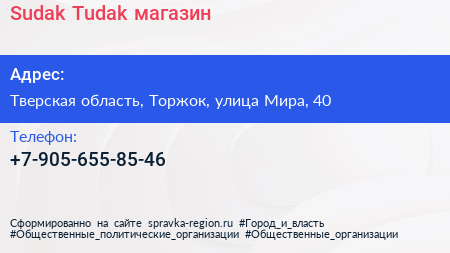 Sudak & Tudak, магазин по адресу Тверская область, Торжок, улица Мира, 40 в дальнейшем Организация, размещена в следующих категориях: