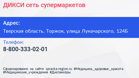 ДИКСИ, сеть супермаркетов по адресу Тверская область, Торжок, улица Луначарского, 124Б в дальнейшем Организация, размещена в следующих категориях: