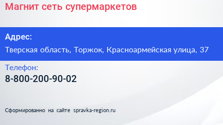 Магнит, сеть супермаркетов по адресу Тверская область, Торжок, Красноармейская улица, 37 в дальнейшем Организация, размещена в следующих категориях: