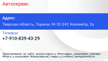 Автосервис по адресу Тверская область, Торжок, М-10 241 Километр, 2а в дальнейшем Организация, размещена в следующих категориях: