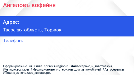 Ангеловъ, кофейня по адресу Тверская область, Торжок, в дальнейшем Организация, размещена в следующих категориях: