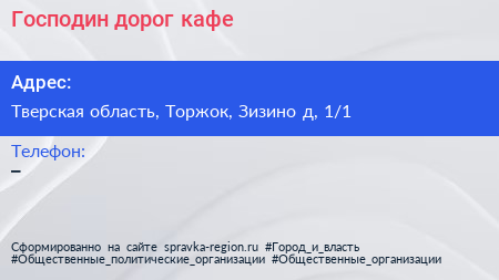 Господин дорог, кафе по адресу Тверская область, Торжок, Зизино д, 1/1 в дальнейшем Организация, размещена в следующих категориях: