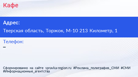Кафе по адресу Тверская область, Торжок, М-10 213 Километр, 1 в дальнейшем Организация, размещена в следующих категориях:
