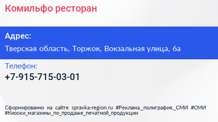Комильфо, ресторан по адресу Тверская область, Торжок, Вокзальная улица, 6а в дальнейшем Организация, размещена в следующих категориях: