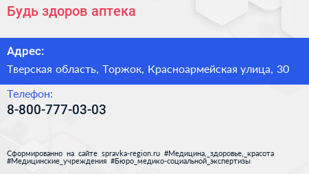 Будь здоров!, аптека по адресу Тверская область, Торжок, Красноармейская улица, 30 в дальнейшем Организация, размещена в следующих категориях: