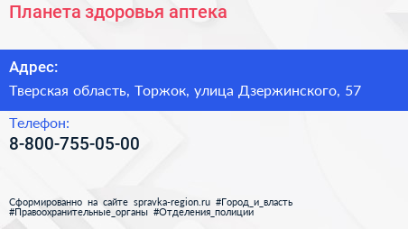 Планета здоровья, аптека по адресу Тверская область, Торжок, улица Дзержинского, 57 в дальнейшем Организация, размещена в следующих категориях: